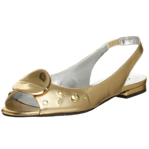 Cool, contemporary details combine with old-fashioned comfort in this stand- out dress flat from Jessica Simpson. Made with soft metallic leather, the upper features a rounded peep-toe design, elasticized slingback, and metal disc and stud accents on the vamp. The low heel and padded footbed give this shoe all-day comfort, while the flexible rubber outsole provides traction and long-lasting wear. Wear with everything from jeans to cocktail dresses.